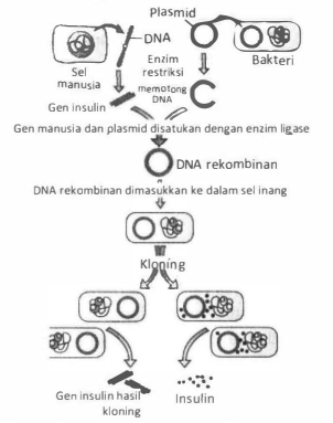 Persiapan Plasmid Vektor: Plasmid, DNA sirkular kecil yang ditemukan pada bakteri, berfungsi sebagai vektor atau "pembawa" gen insulin. Plasmid dipilih karena kemampuannya untuk bereplikasi secara independen di dalam sel bakteri. Plasmid juga dipotong menggunakan enzim restriksi yang sama dengan yang digunakan untuk mengisolasi gen insulin, menciptakan celah di mana gen insulin dapat disisipkan. Rekayasa plasmid adalah kunci keberhasilan tahapan ini.